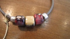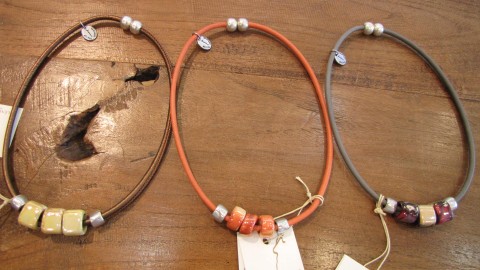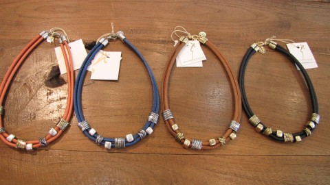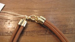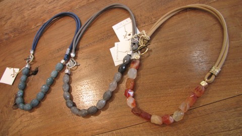 チョーカーよりも長めの革紐に、カラフルなストーンがヘッドになったペンダント。こちらも留め金がなく、マグネット式になります。
