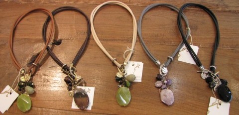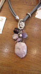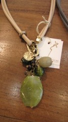2重になった革紐。。。ストーンと同色系ビーズのジャラジャラ感がゴージャスな留め金式のペンダント。。。