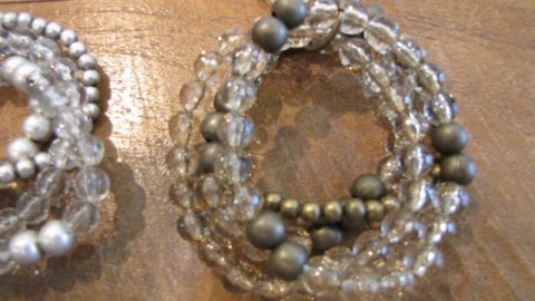 幾重にも重なったブレスは、パーツで一つに留めてあるので、一度に取外しが出来て便利。伸縮性のあるテグスで作ってあるので装着し易さは言う事なし♪♪